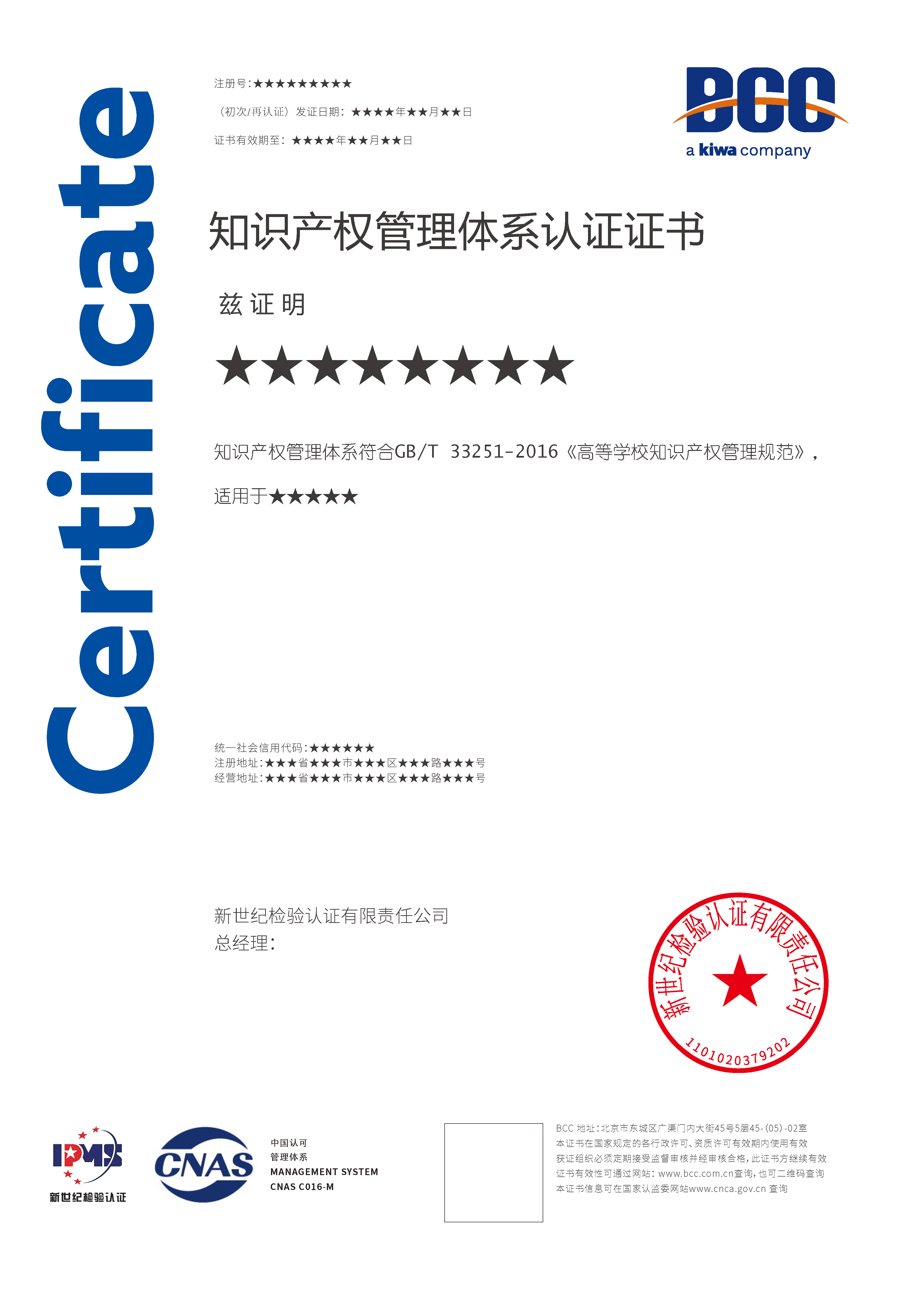 Kiwa BCC是首批獲CNAS認(rèn)可的知識產(chǎn)權(quán)認(rèn)證機(jī)構(gòu),可為企業(yè)頒發(fā)帶有“CNAS”標(biāo)識的知識產(chǎn)權(quán)管理體系認(rèn)證證書。認(rèn)證所用標(biāo)準(zhǔn)包括:GB/T 29490-2023《企業(yè)知識產(chǎn)權(quán)合規(guī)管理體系要求》、GB/T33250-2016《科研組織知識產(chǎn)權(quán)管理規(guī)范》、GB/T33251-2016《高等學(xué)校知識產(chǎn)權(quán)管理規(guī)范》。